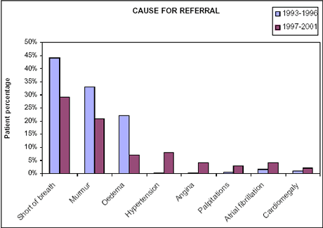 Data was collected retrospectively by assessment of individual request cards and corresponding echo reports. This data was then collated over 2 time periods i.e 1993-1996 and 1997-2001. In the period between 1996- 1997 the service was briefly suspended due to staffing problems.